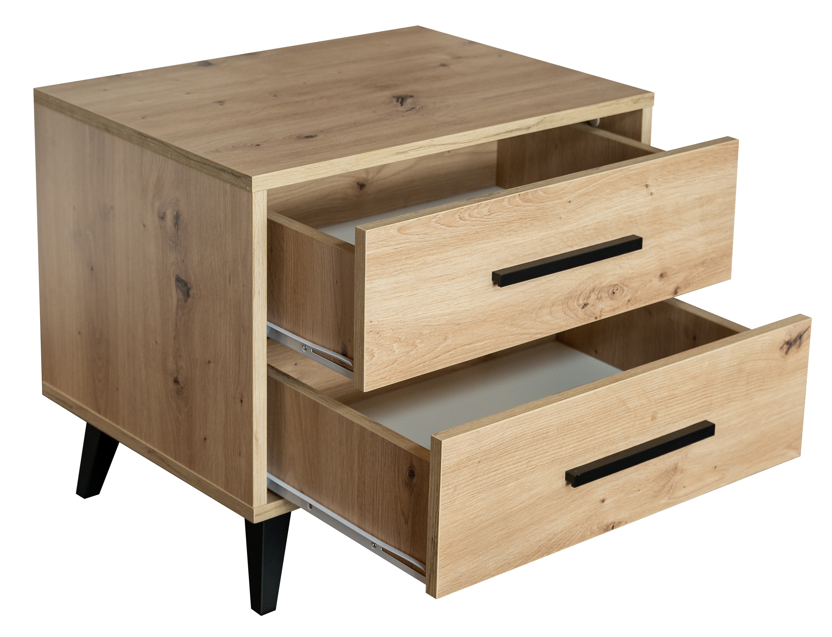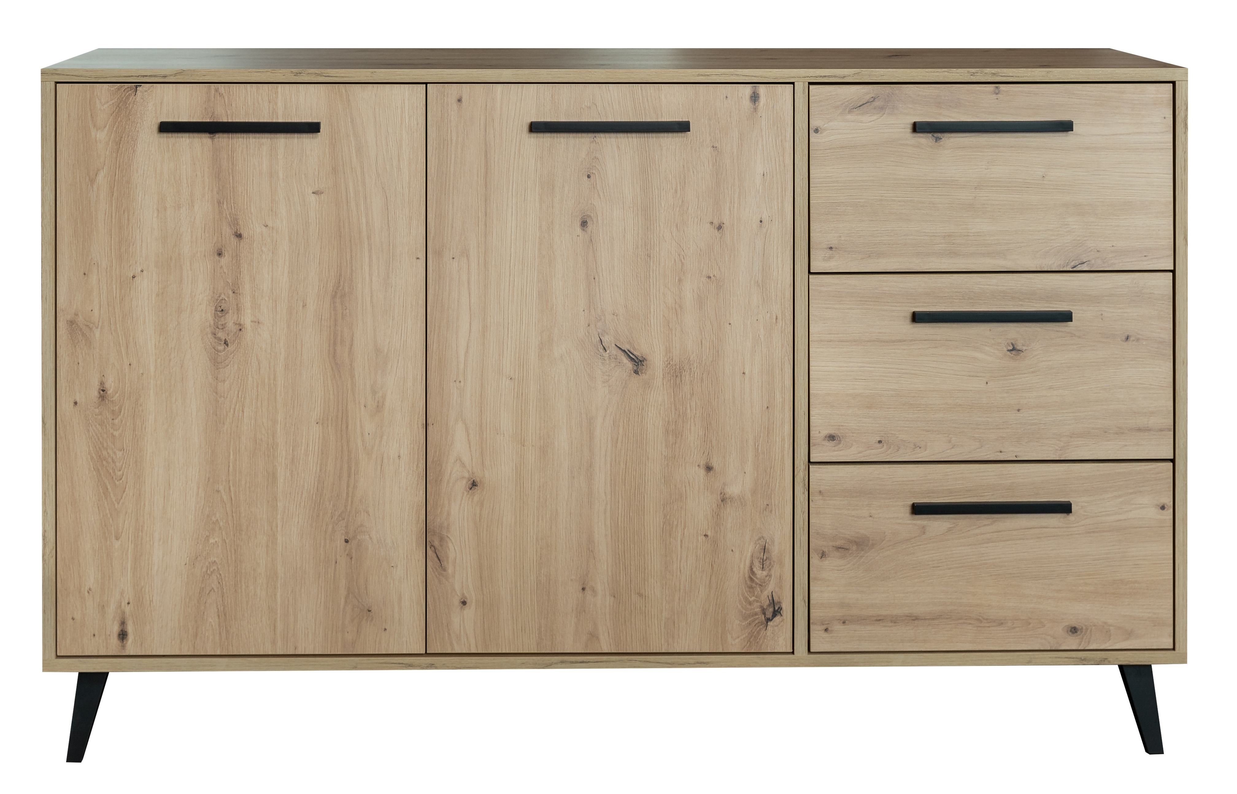 Komoda SK w kolorze dąb artisan to przykład mebla który wyposażony jest w skośne nogi i wysokie na 12 cm wysokości nogi (większość popularnych modeli robotów odkurzających powinna być w stanie się pod nią zmieścić). Sam mebel wykonany jest z wysokiej jakości płyty laminowanej.