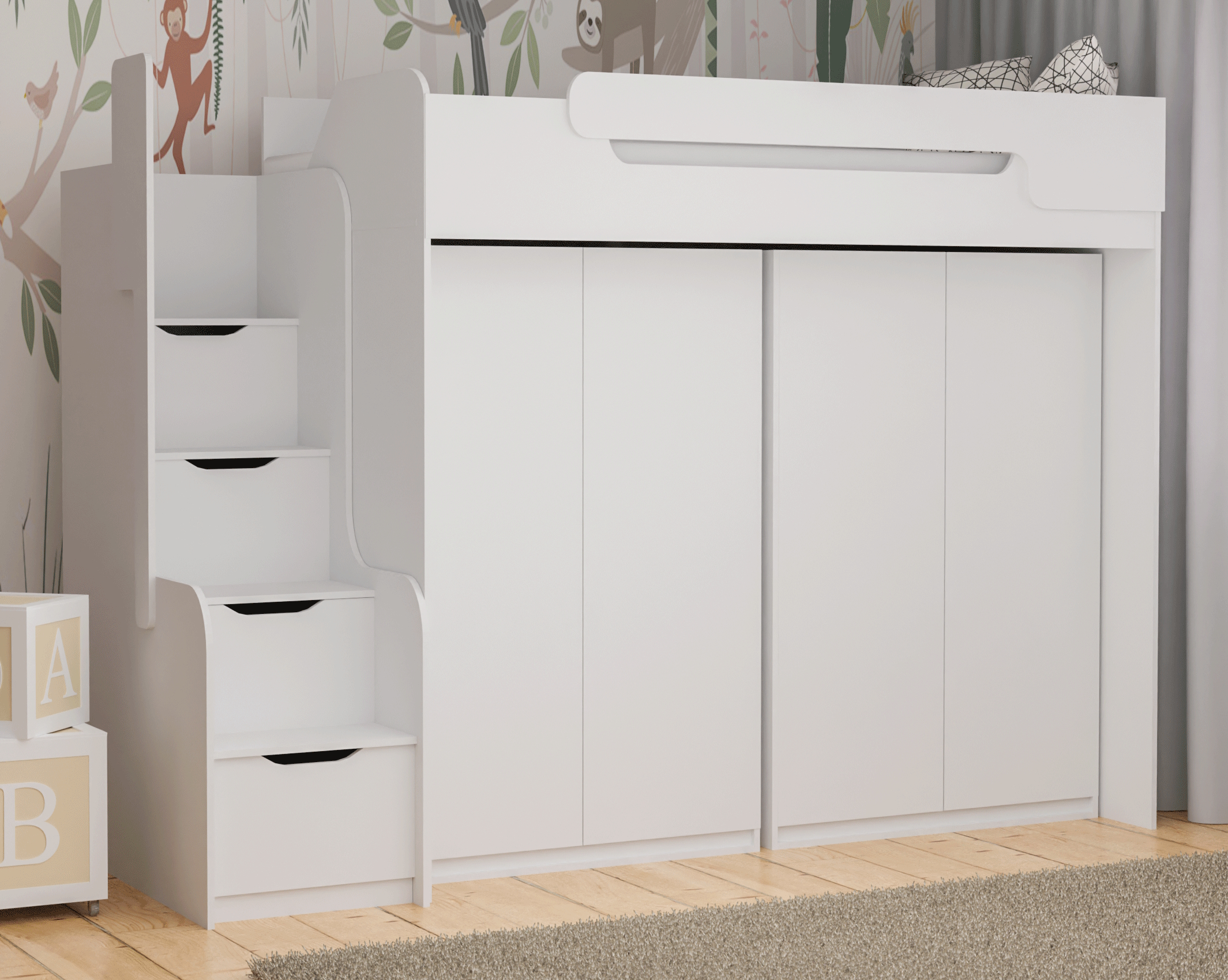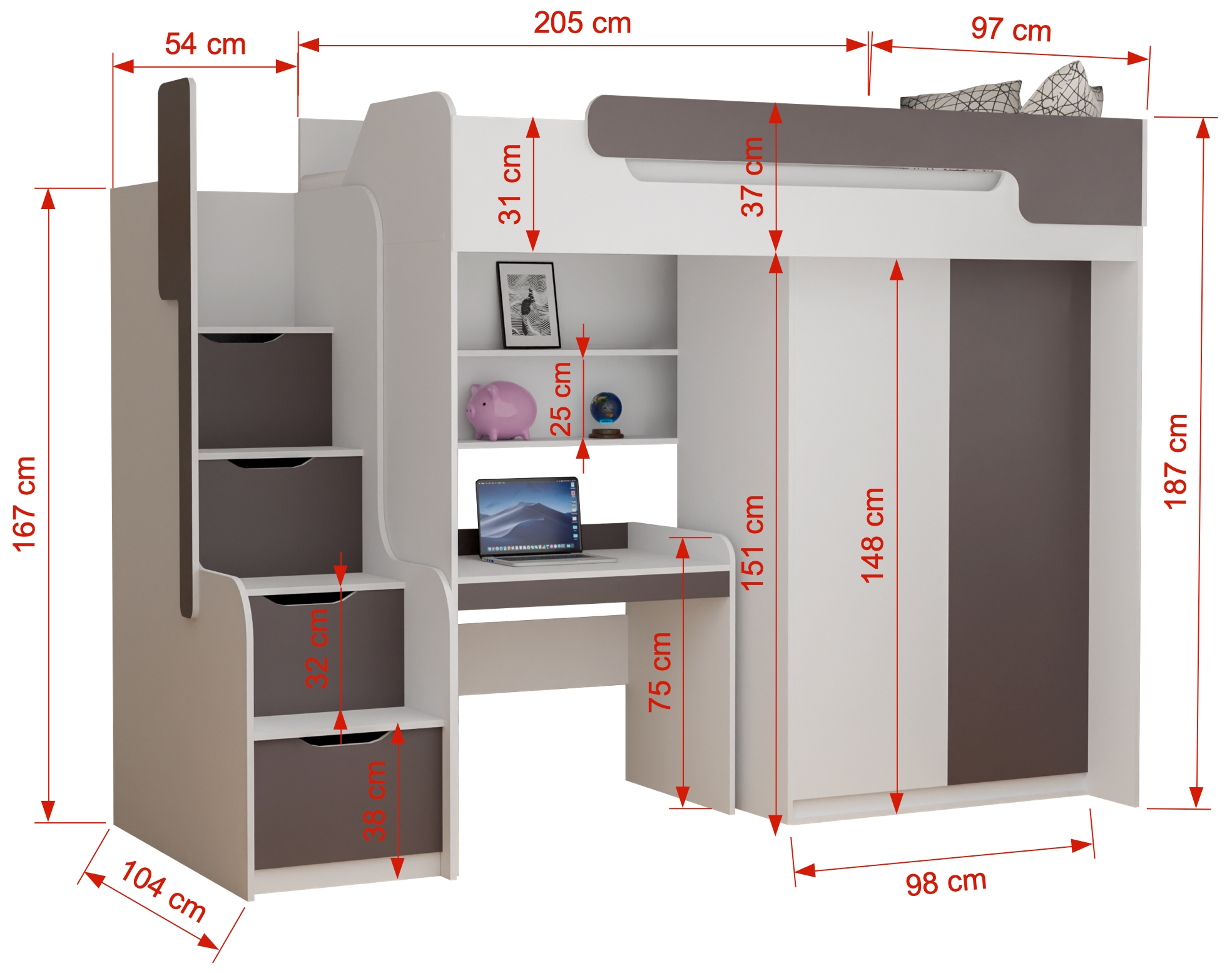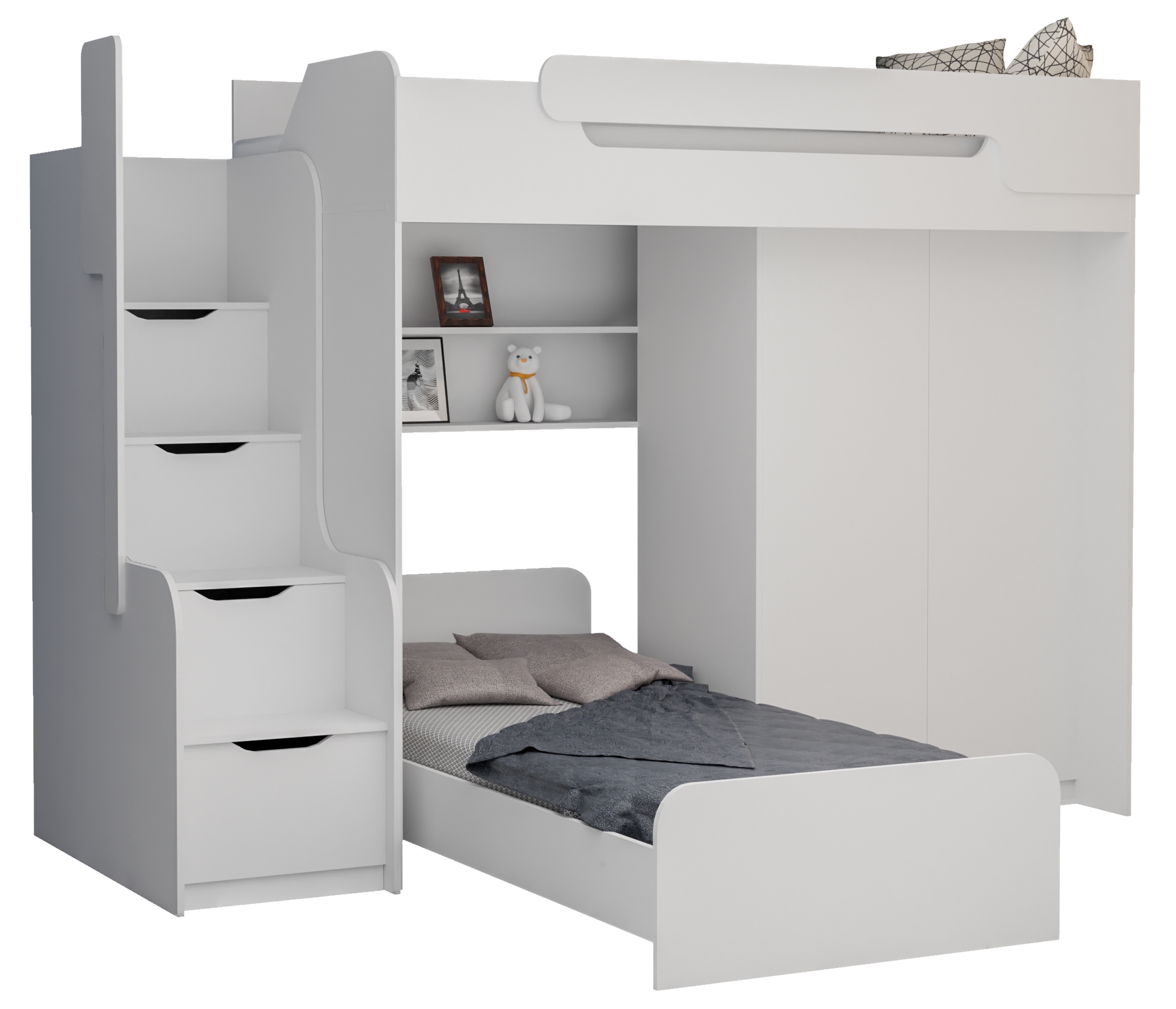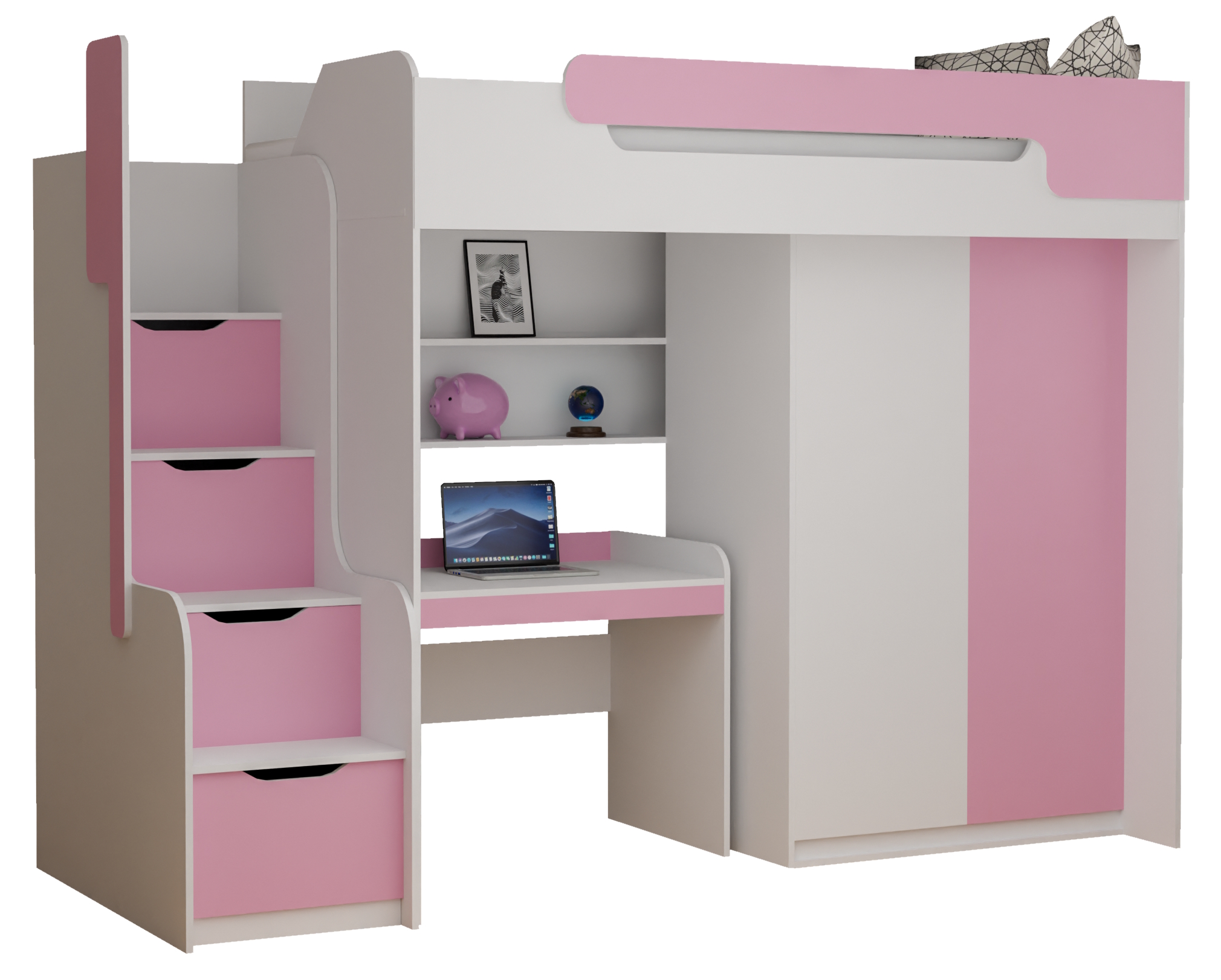 Piętrowe łóżko BD1 to funkcjonalna antresola stworzona z myślą o dzieciach i młodzieży. To idealne rozwiązanie do mniejszych pokoi, w których liczy się każdy metr przestrzeni. Konstrukcja łączy w sobie łóżko na antresoli, biurko oraz pojemną szafę, tworząc praktyczną strefę snu, nauki i przechowywania w jednym meblu.