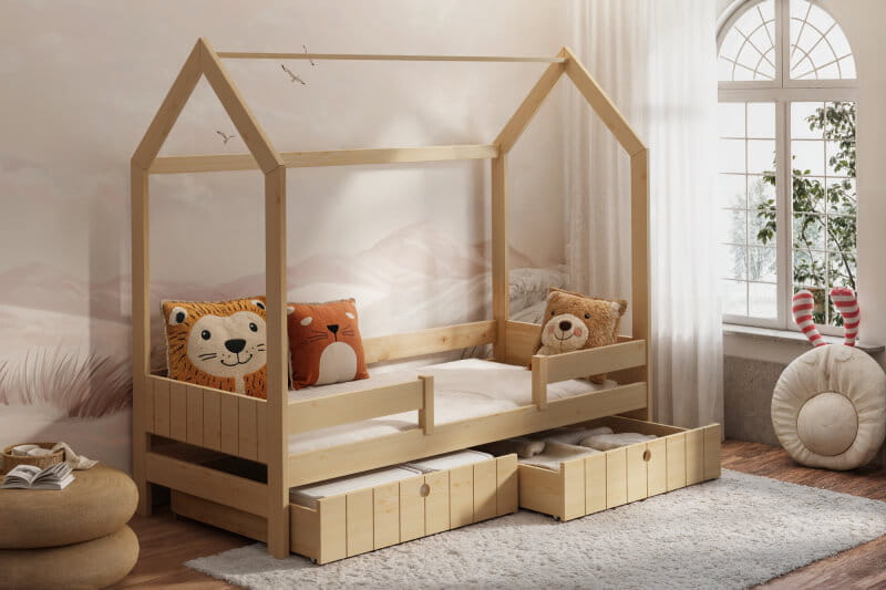 Charakterystyczna konstrukcja w kształcie domku pobudza wyobraźnię dziecka i tworzy idealne miejsce do odpoczynku i zabawy. Dwie pojemne szuflady pod łóżkiem zapewniają dodatkowe miejsce na pościel, zabawki lub ubrania, a wygodne wejście między barierkami ułatwia samodzielne korzystanie z łóżka