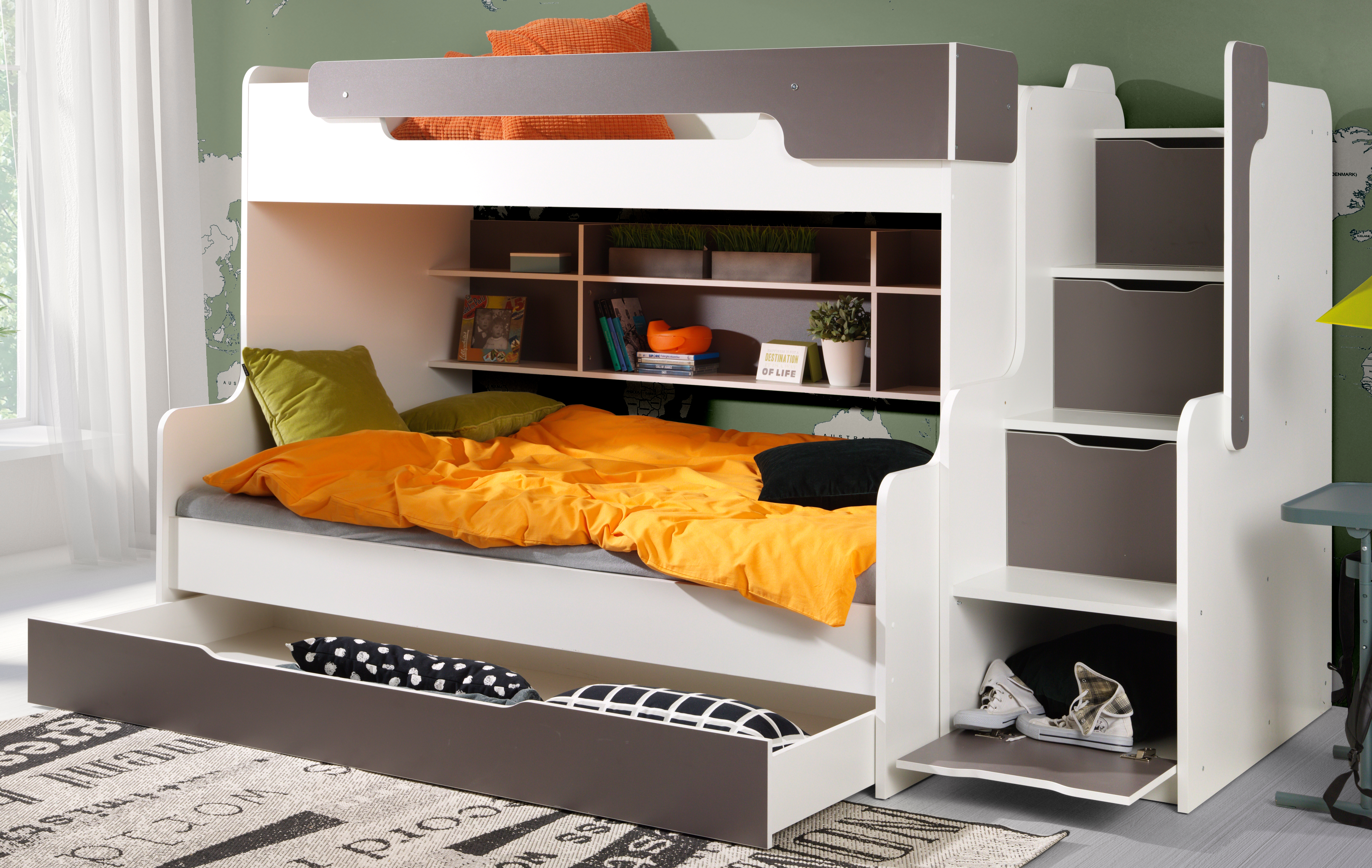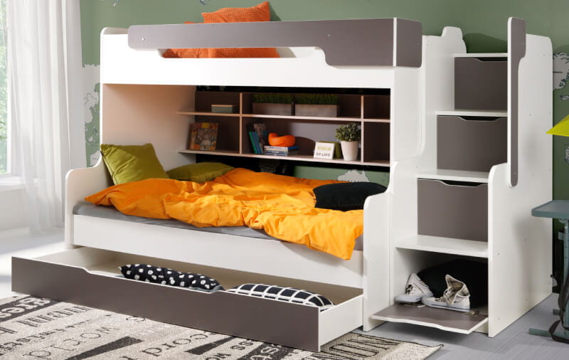 Konstrukcja łóżka została zaprojektowana z myślą o maksymalnej wygodzie użytkowania. Schody pełnią jednocześnie funkcję schodków, zapewniając dodatkowe miejsce na pościel, zabawki lub ubrania. Pomiędzy poziomami znajduje się praktyczny regał, który umożliwia przechowywanie książek i drobiazgów w zasięgu ręki.