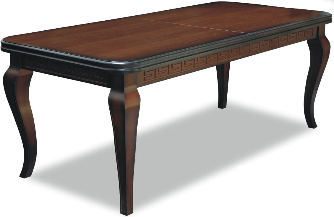 Oryginalny, stylowy stół rozkładany ZM37 wykonany z drewna bukowego z blatem w naturalnej okleinie dębowej lub bukowej z nogami typu "Ludwik". Pokryty wysokogatunkową bejcą i lakierami z ochronną warstwą akrylową odporną na wysokie temperatury. Oskrzynia stołu - stylizowana (meander ciągły z załamującymi się pod kątem prostym liniami).