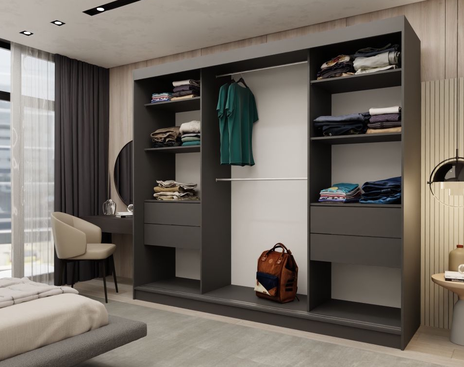 W szufladach można przechowywać rzeczy, które nie powinny być na widoku, np. bieliznę, akcesoria czy dokumenty. Mebel posiada również półki oraz 2 drążki.