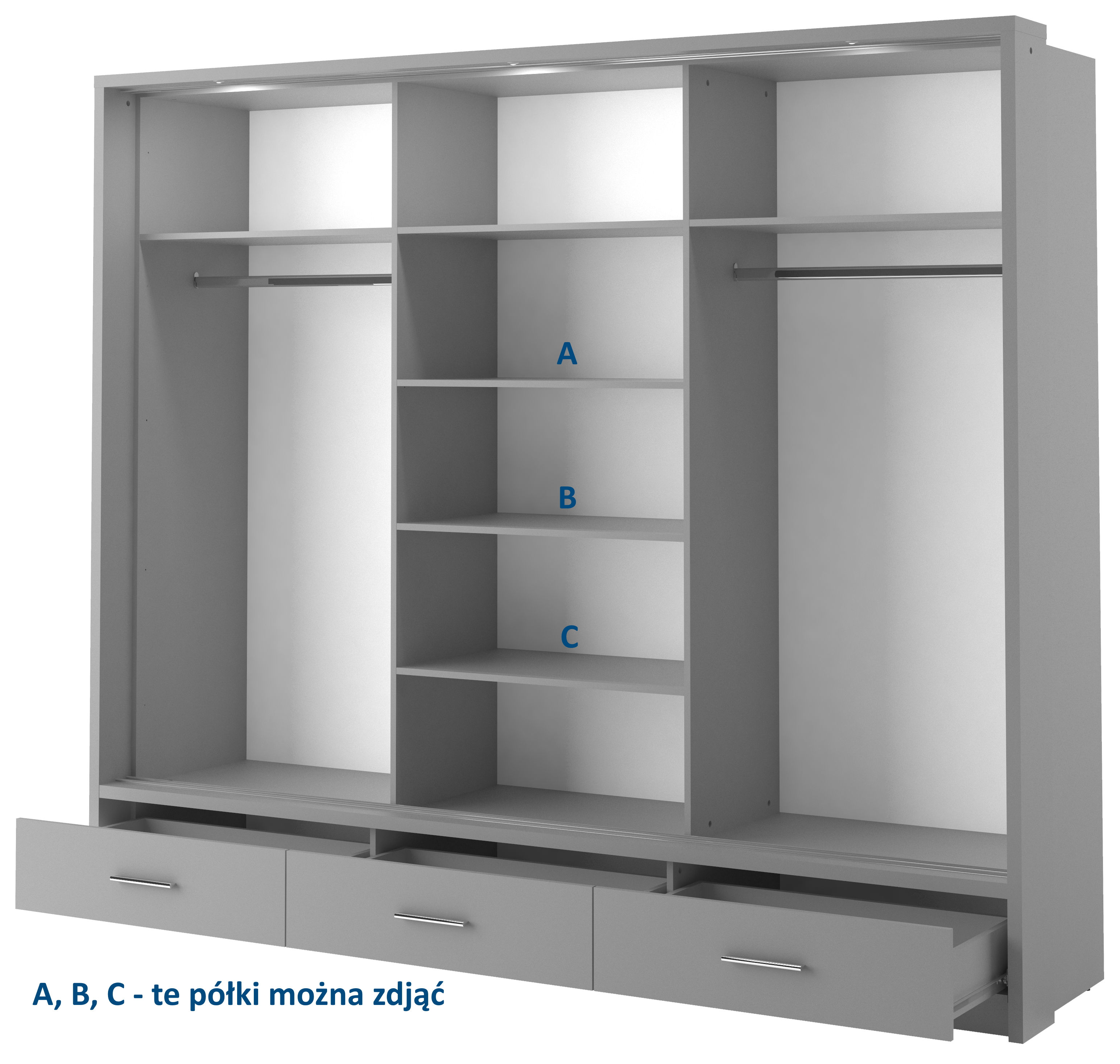 Poza bielą, szafa występuje też w kolorze szarym, i na tym przykładzie pokazane jest wnętrze mebla. Oczywiście w przypadku zamówienia szafy w kolorze białym, środek też będzie biały.