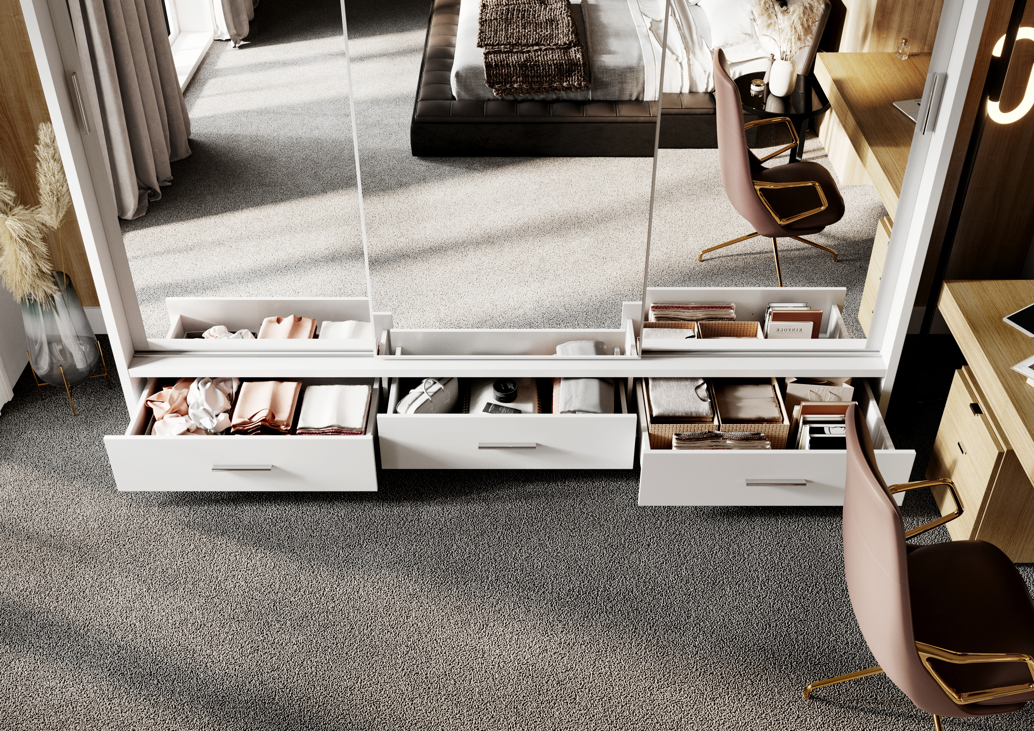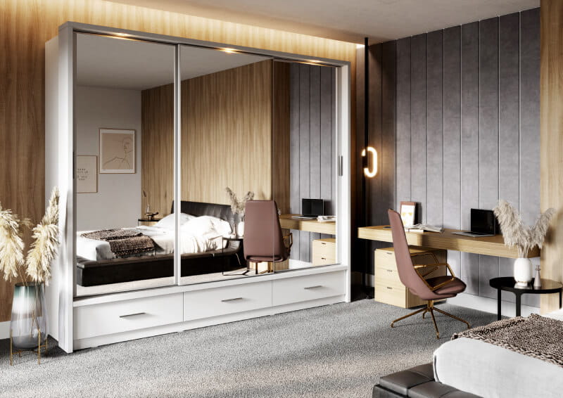 Szuflady wbudowane w szafę to dobry pomysł, zwłaszcza gdy nie ma miejsca na dodatkową komodę. W prezentowanym modelu szafa wyposażona jest w szuflady zewnętrzne