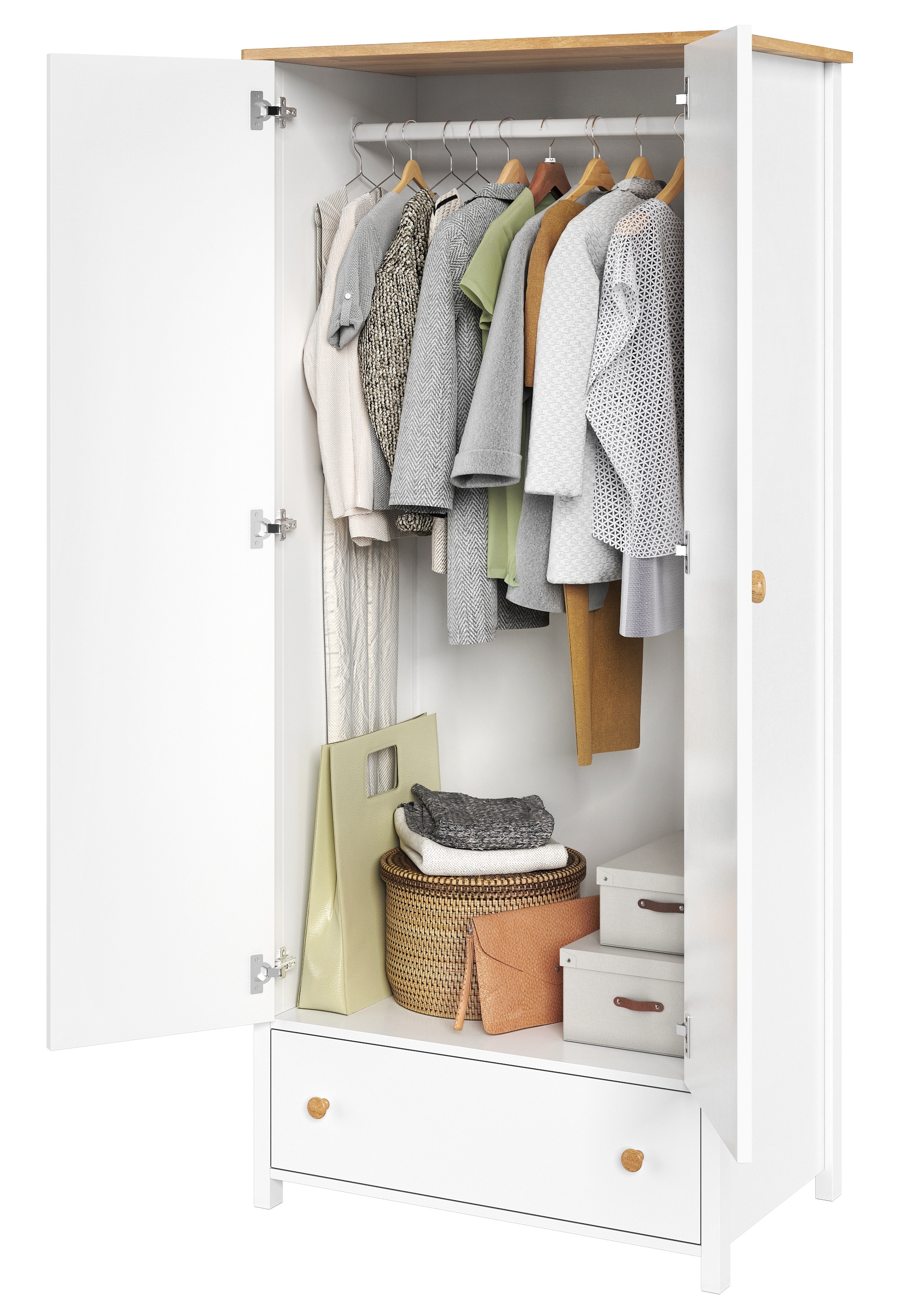 Wewnątrz znajduje się długi drążek, który pozwala wygodnie przechowywać ubrania w pozycji wiszącej. W dolnej części umieszczono pojemną szufladę, idealną na akcesoria i tekstylia.