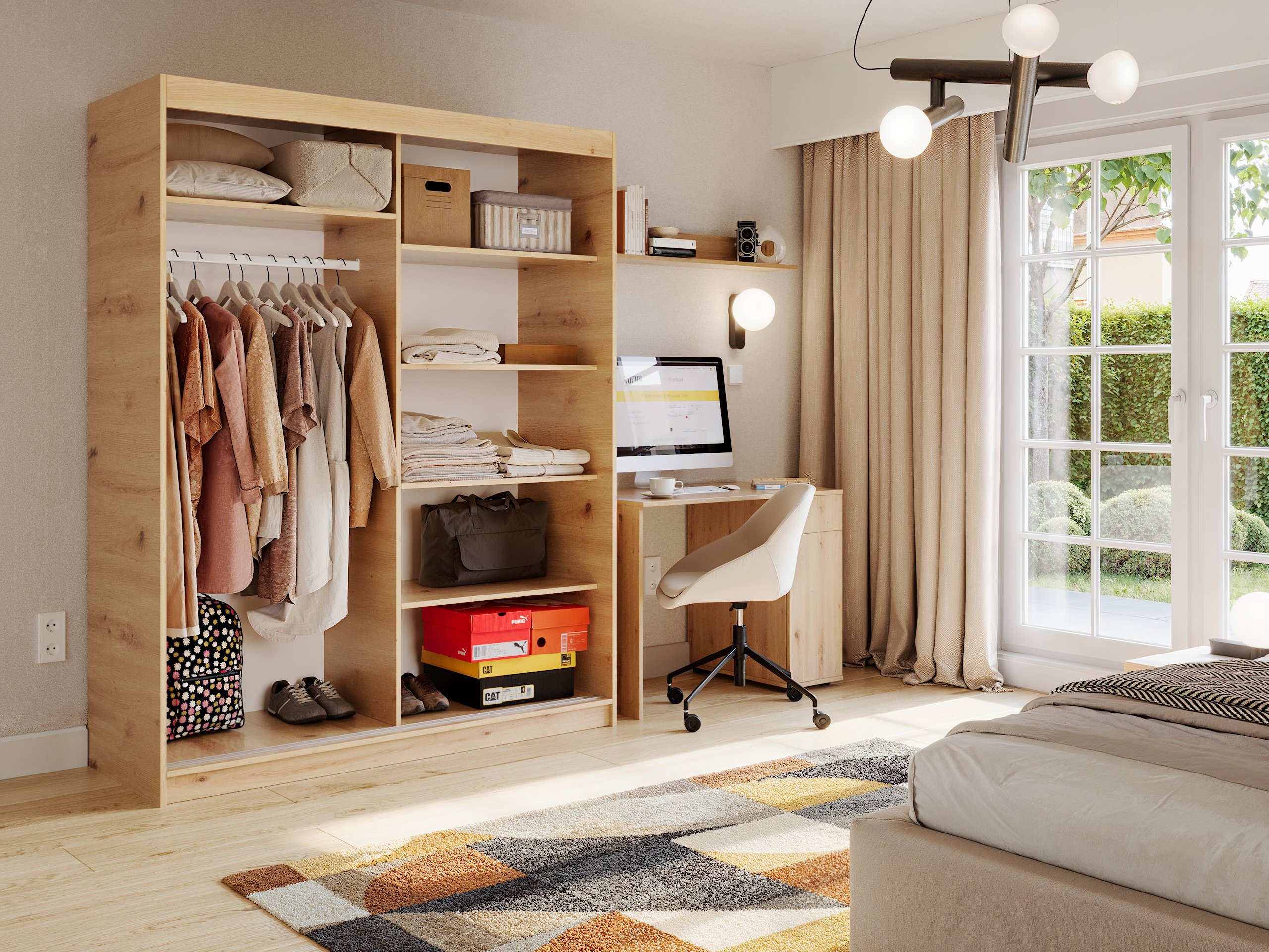 Mebel wykonany jest z wysokości jakości płyty laminowanej. Środek w kolorze korpusu - dąb artisan. Wewntąrz półki i drążek do wieszania ubrań