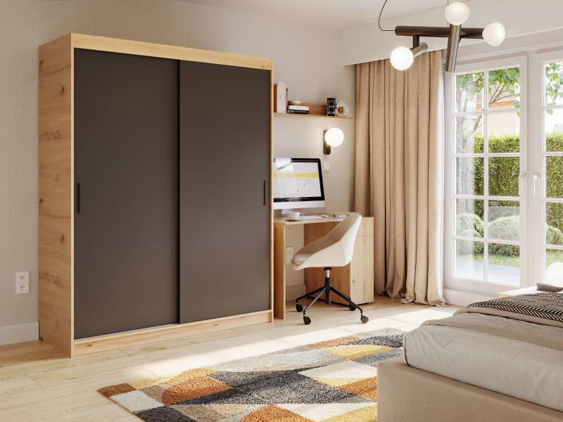 Szafa przesuwna TI w nowoczesnym i przytulnym zestawieniu czarnych drzwi i korpusu w kolorze dąb artisan.