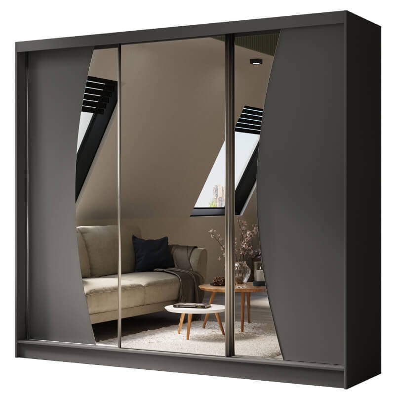 Szafę MV wyróżniają dwie cechy dzięki którym z łatwością możemy wyobrazić sobie ten mebel jako element sypialni w nowoczesnym stylu: szary kolor, który idealnie wpisuje się w estetykę minimalistycznych wnętrz, oraz wzór wygiętych luster, który nadaje szafie oryginalny wygląd.