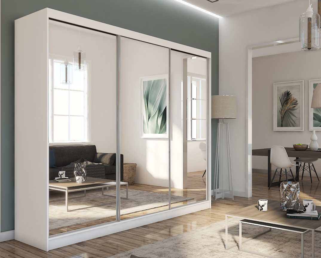 Szafa z drzwiami przesuwnymi MD biała z trzema lustrami. Jednakowo do luster podzielone jest wnętrze szafy. Lewą i prawą stronę stanowią półki ubranione, a część środkowa (nieco szersza) to dwa drążki. W związku z tym że boczne półki można zdjąć i zamontować drążek na którejś z tych bocznych części (lub obydwu), to istnieje możliwość stworzenia dużej przestrzeni do wieszania ubrań. Szafa w standardzie posiada dwa drążki, gdzie górny jest 78 cm nad dolnym, a dolny 82 cm nad podłogą szafy (oczywiście nie trzeba obydwu montować, a jeden z nich może podłużyć do stworzenia własnej odmiany środka). Fronty szafy "opierają się" na aluminiowych prowadnicach Laguna. System jezdny obejmuje również kółka łożyskowane i gumowane. Amortyzację podczas zamykania zapewnia szczotka odbojowa. Szafa 240'ka występuje tylko w kolorze białym. Istnieje również możliwość zamówienia szafy w mniejszych rozmiarach tj. 120, 150, 160, 180 lub 200cm szerokości (dla szaf 120, 150, 180 i 200 możliwa kolorystyka: biały, czarny, szary, dąb, sonoma, wenge). Można także zastosować jedno lustro lub pozostawić szafę z frontami całymi w kolorze białym.