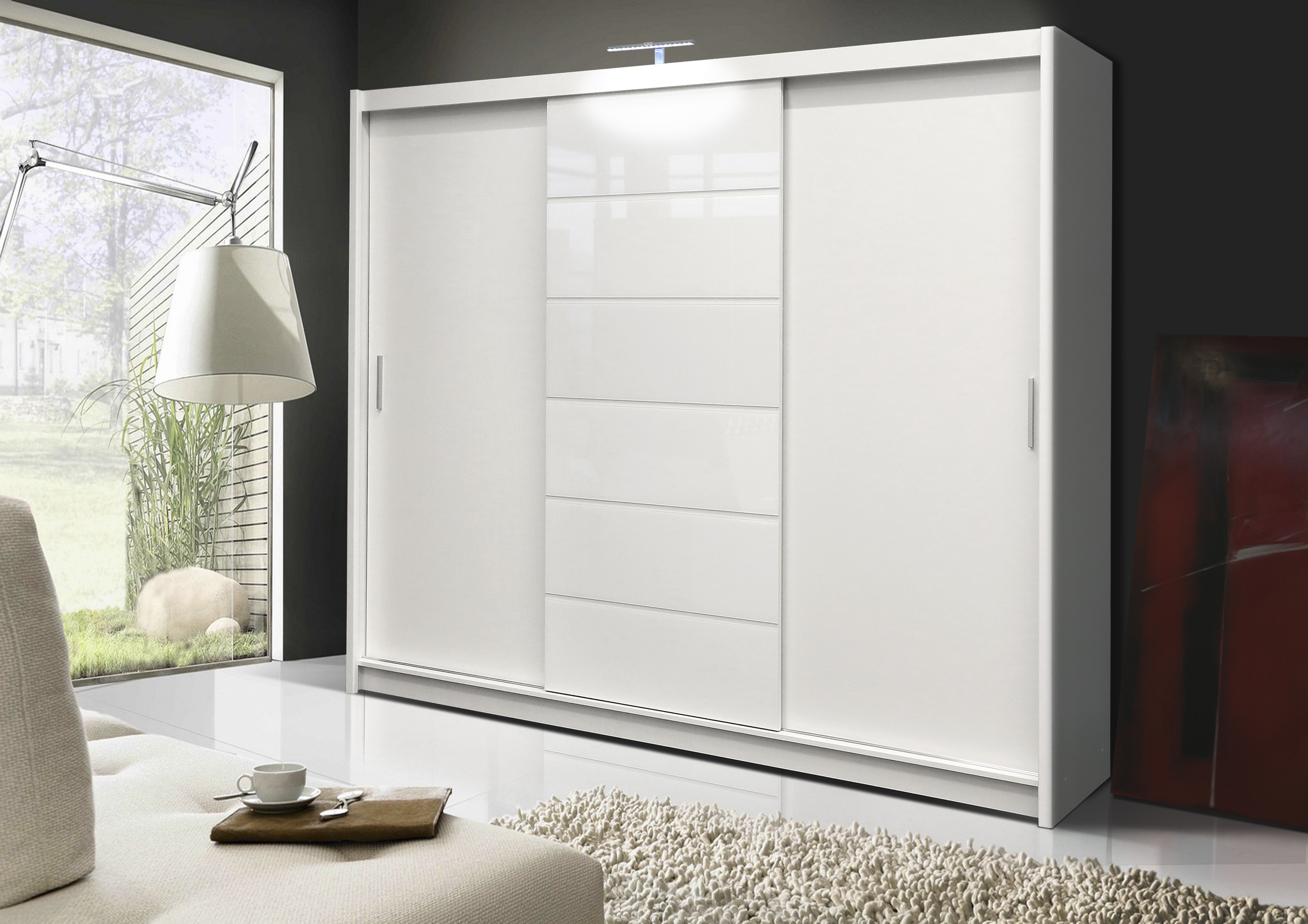 Na przykładzie sonomy pokazany jest układ środka (w przypadku zamówienia szafy w bieli, środek też będzie biały). Wnętrze to półki, dwie szuflady wewnętrzne (umieszczone za drzwiami przesuwnymi) oraz drążek na wieszaki